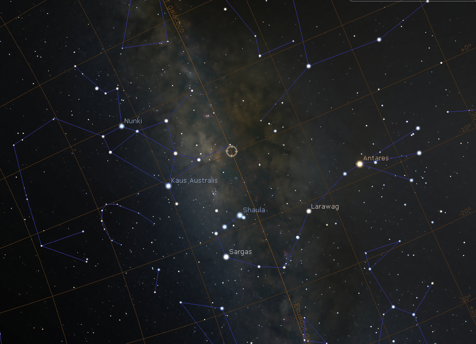 On the stellar chart above, an arrow indicates the galaxy center, along with stellar clusters (M6 & M7) and nebulae (M20 & M8).