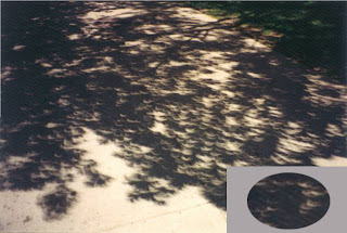| Fíjate la diferencia con la imagen anterior, aquí la luz pasando a través de las hojas cuando hay un eclipse. Abajo a la derecha un detalle de la luz que tiene la forma del eclipse. |