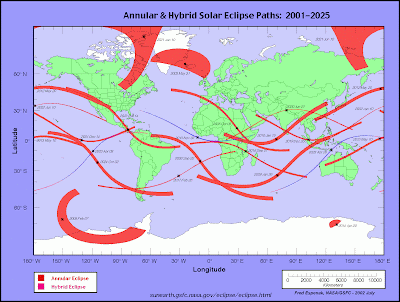 Las zonas azules representan el camino de la sombra lunar sobre la superficie terrestre. Los eclipses híbridos son los que son en una parte totales y en otra anulares. Están en el segundo mapa.