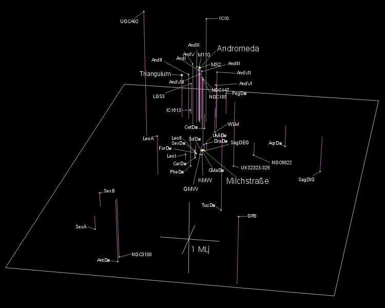 Las galaxias principales son M31 (Andromeda) que es la mayor, la Vía Láctea y la tercera en masa, M33.