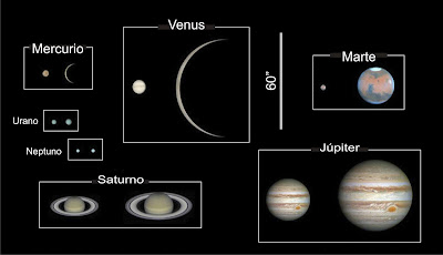 De Mercurio a Saturno, se ven a simple vista como estrellas brillantes, Mercurio y Venus blancos, Marte rojizo, Júpiter y Saturno amarillentos.