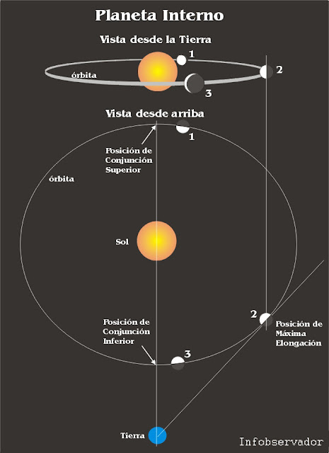 La Superior, es cuando el planeta se encuentra la máxima distancia posible de la Tierra. Como el Sol ilumina su cara completa tal como se desde nuestro planeta, su aspecto es similar al de la Luna Llena. En la inferior, se parece a la Luna Nueva. En las Máximas Elongaciones, es como un cuarto.