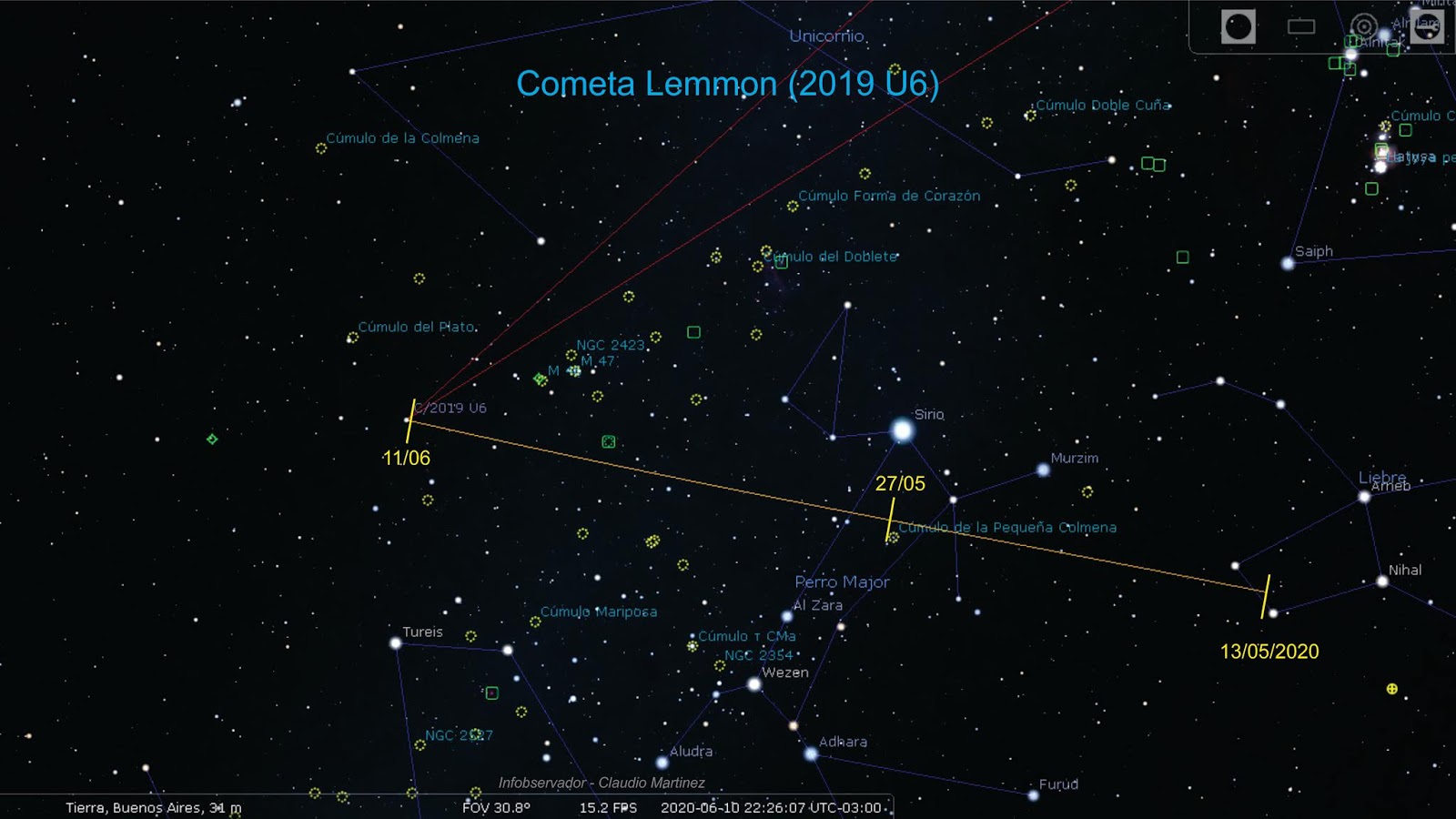 Pasará muy cerca de objetos brillantes o estrellas notables, lo que facilitará encontrarlo. De hecho el 27/5 pasa a pocos grados de Sirio.