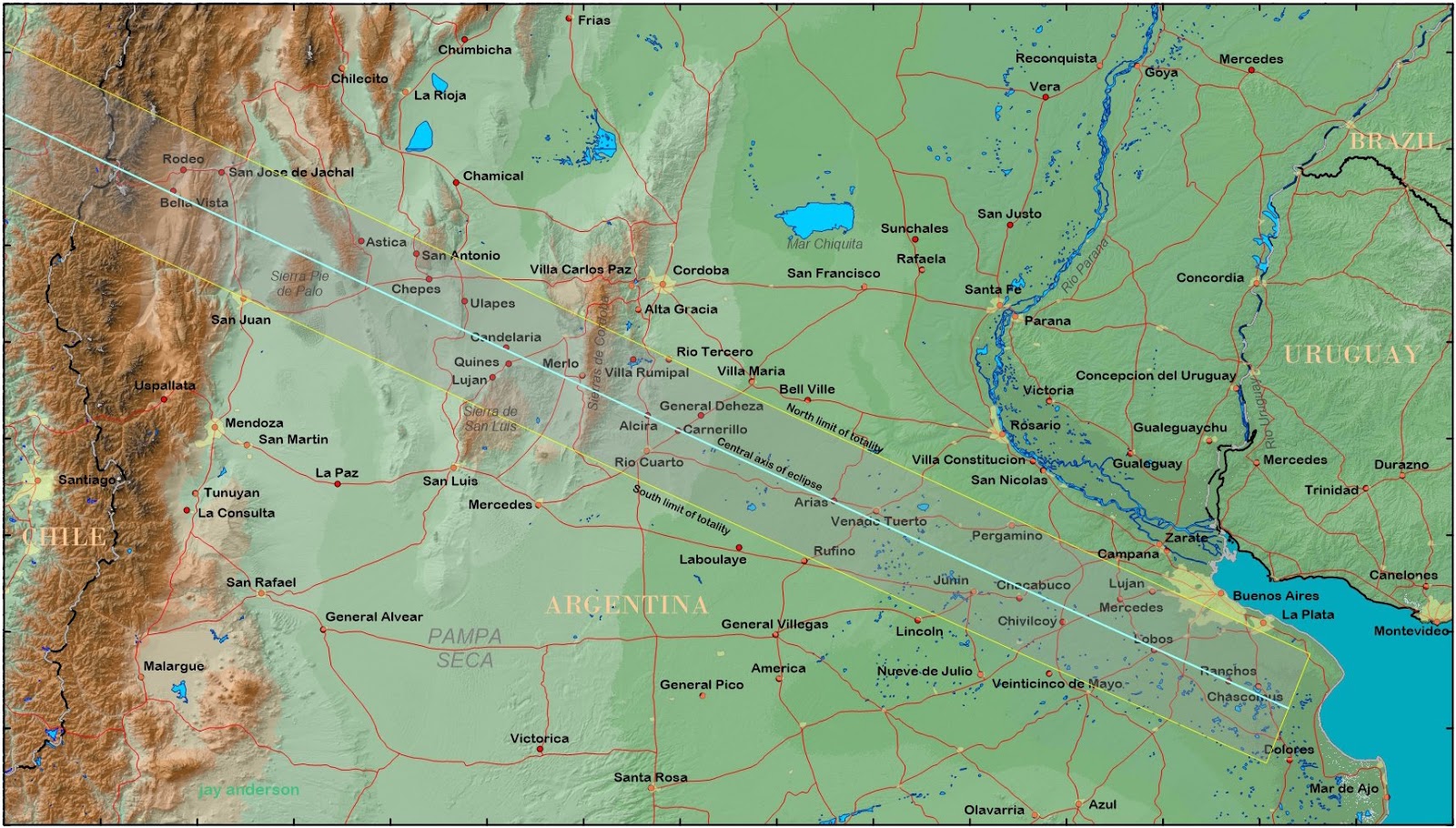 Como comenté antes, aunque la mayoría está organizando viaje más cerca de la Cordillera, la realidad es que por el porcentaje de nublado es prácticamente lo mismo (30% de nublado contra 40% cerca del Atlántico). El ancho de la sombra es de 90 km. Su duración máxima de 2 minutos 10 segundos.