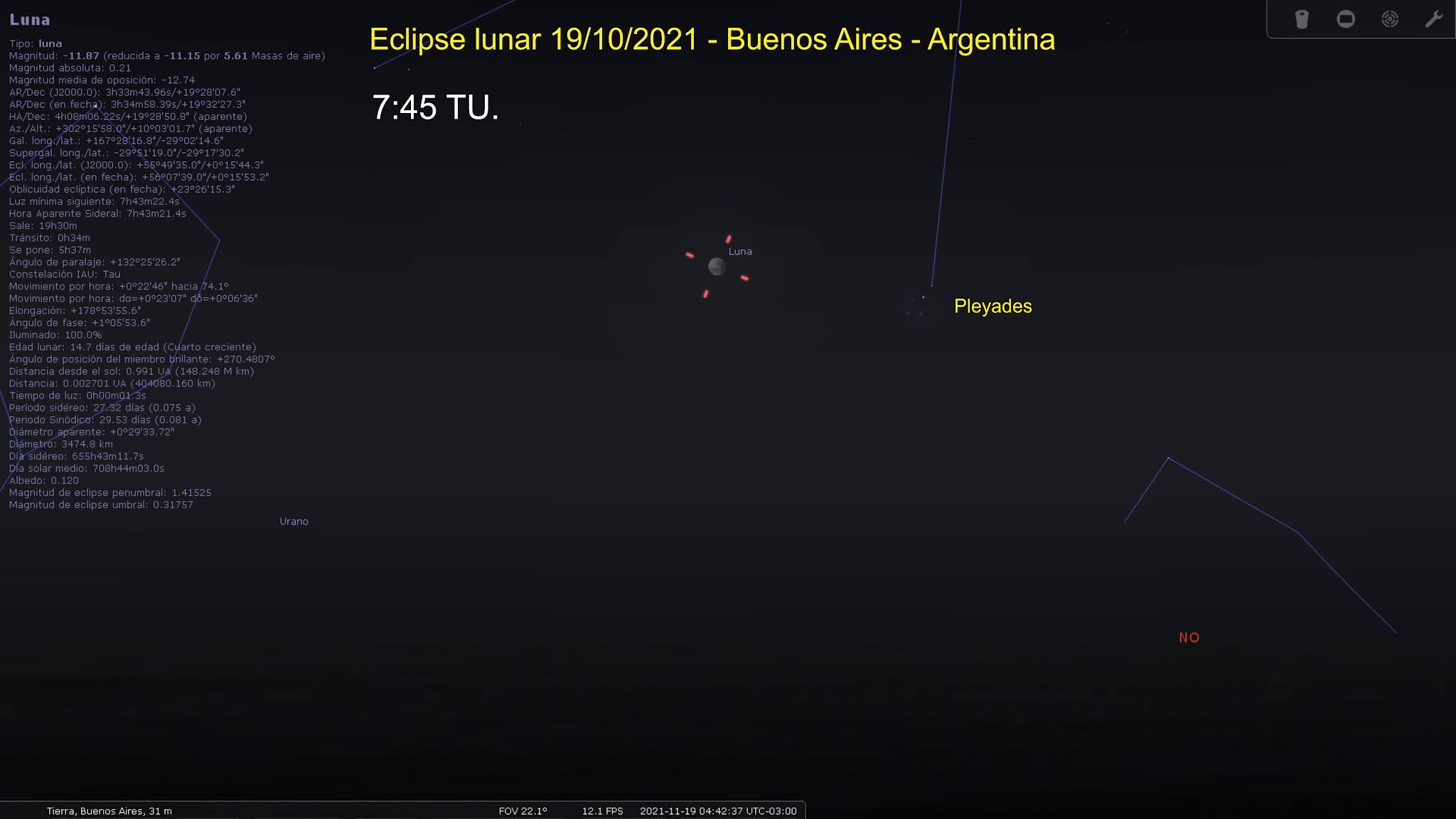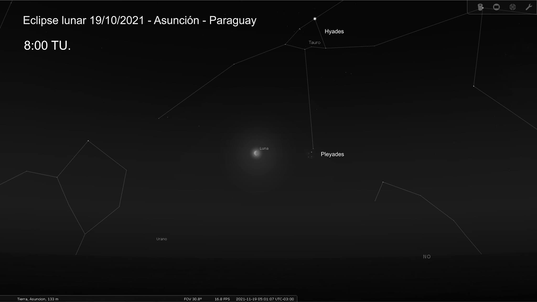 Por todo ello, hice dos mapas. Uno es cuando el horario permite ver bastante bien las estrellas débiles. El segundo, en mi criterio, a partir de este horario, el cielo va clareando tanto que, a pesar de que el eclipse es más profundo, se verá peor.