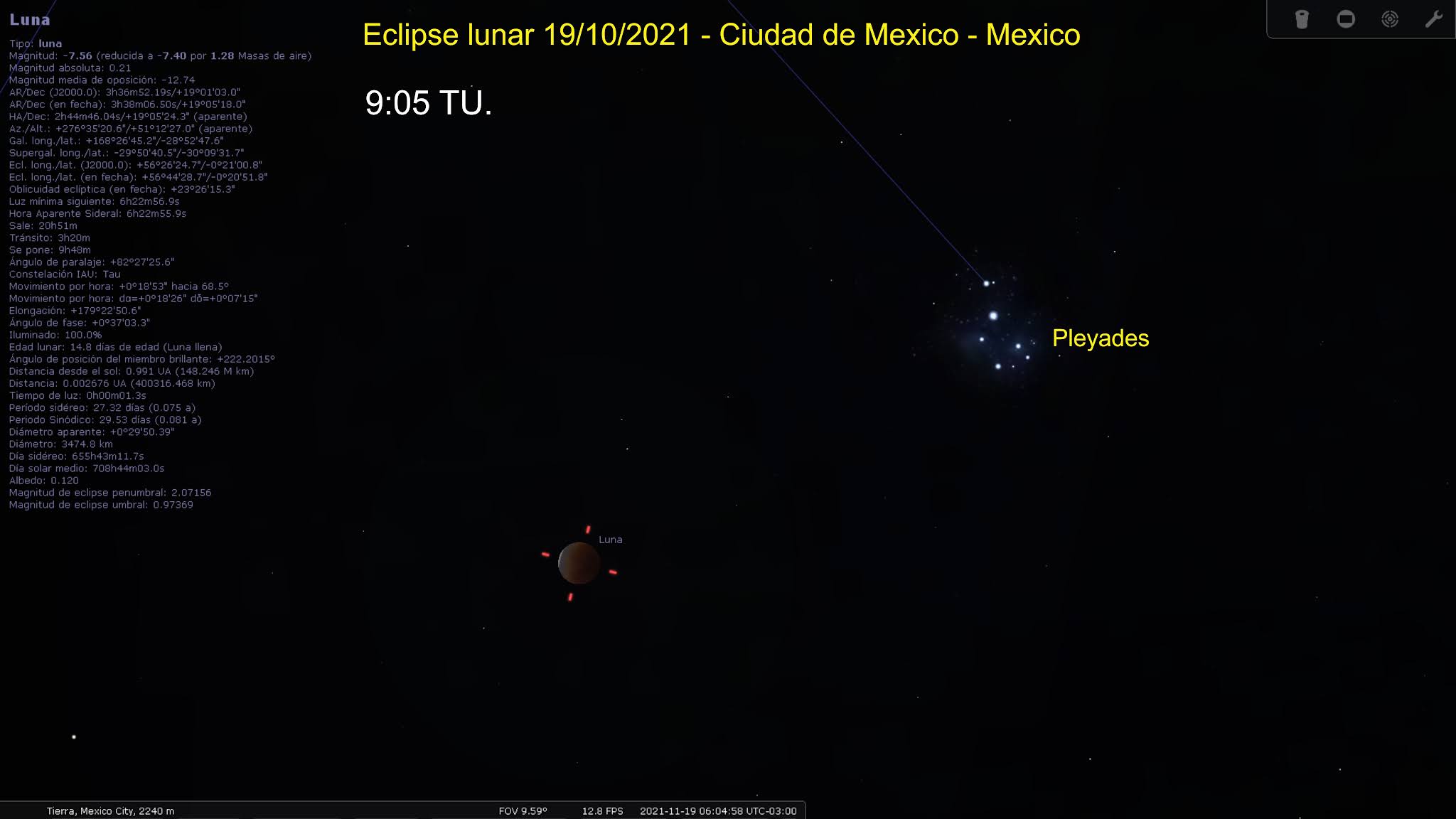Aquí si se ve muy bien en noche cerrada, en el máximo (no es un eclipse total). El momento del máximo es cerca de las 9:05 TU.