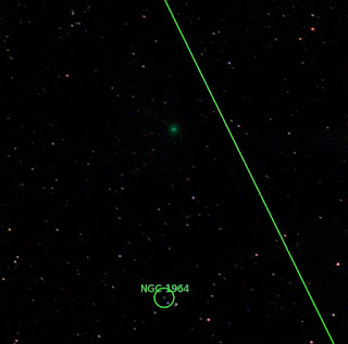 Arriba del centro se ve el cometa, con su característico color verdoso. Foto: José Luis Sanchis. |