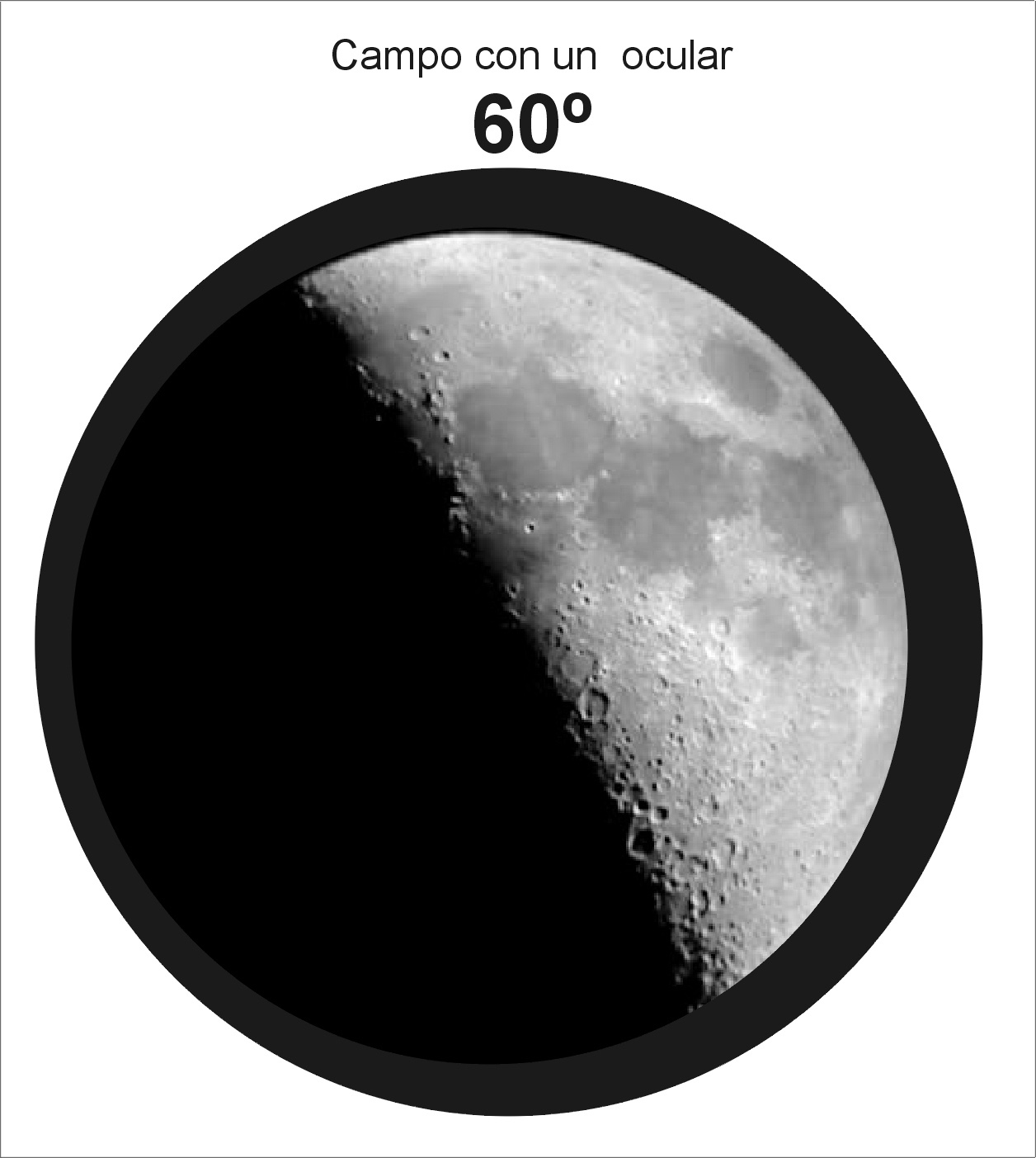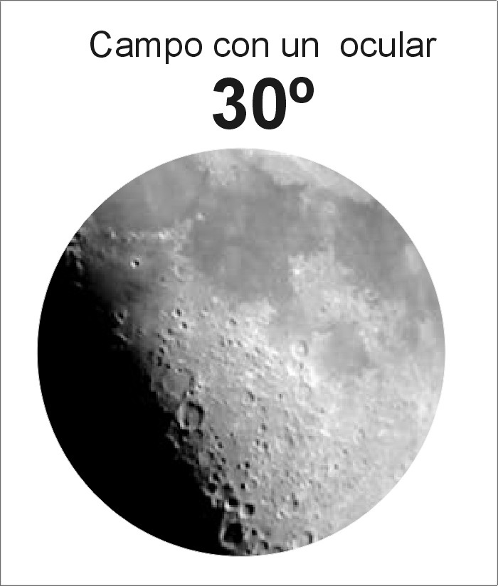 Con el ejemplo de la Luna, si cambias de un ocular 30° a un ocular 60° de campo tendrás el mismo aumento, pero verás dos veces mas cielo que el tamaño de la Luna. En las imagenes de abajo, aunque no lo parezca, el tamaño de la Luna es siempre el mismo, cambiando solo el campo del ocular.