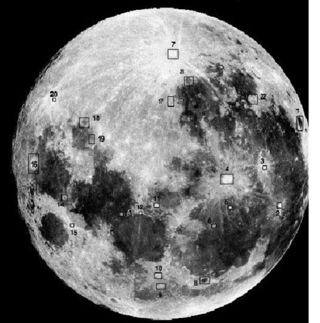 Los cráteres utilizados normalmente son: 1: Grimaldi – 2: Aristarchus (muy brillante) – 3: Kepler – 4: Copernicus (grande) – 5: Pytheas (pequeño, brillante) – 6: Thimocharis – 7: Tycho (brillante) – 8: Plato (grande, oscuro) – 9: Aristóteles – 10: Eudoxus – 11: Manilius – 12: Menelaus (brillante) – 13: Plinius – 14: Taruntius (brillante) – 15: Proclus (brillante) – 16: Langrenus (brillante) – 17: Archazel – 18: Fracastorius (oscuro) – 19: Theopilus – 20: Petavius – 21: Pitatus (oscuro) – 22: Gassendi.