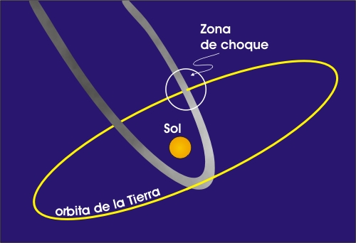| Diagrama simple de una lluvia meteórica. Un cometa va dejando rocas a lo largo de su órbita durante mucho tiempo. Cuando Tierra cruza esa zona se encuentra con miles de rocas que forman la lluvia. |