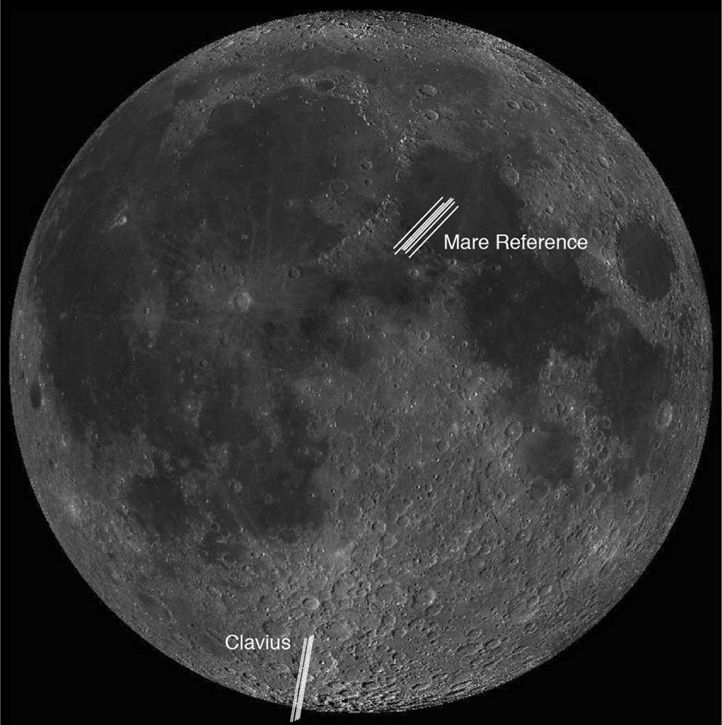 Las zonas analizadas. Clavius, abajo, se detectaron moléculas de agua. Arriba, zona de control, casi sin moléculas.