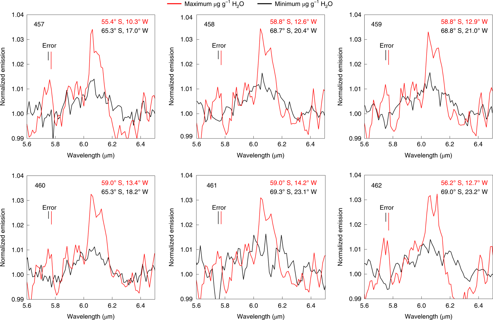 Todos los espectros de la región de Clavius exhiben esta característica de emisión de 6 µm. La mayoría de estos picos de emisión (98%) superan la significación de 2σ en relación con el ruido de fondo, y aproximadamente el 20% superan la significación de 4σ.