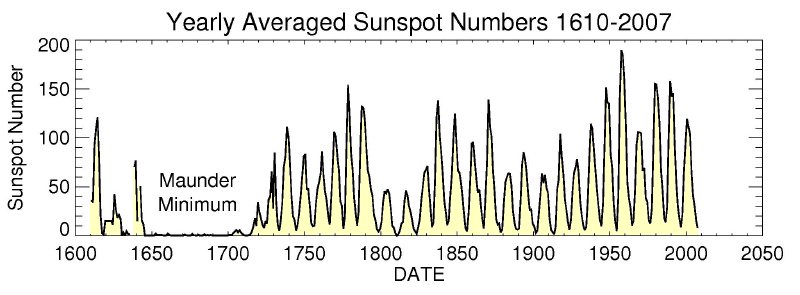 El gráfico arriba requiere algunas aclaraciones. En el eje vertical, la actividad solar. Cada pico es el máximo de actividad, y la distancia en tiempo de dos mínimos es aproximadamente 11 años. Representa el periodo desde 1600 (cuando Galileo comenzó las observaciones) hasta la actualidad.