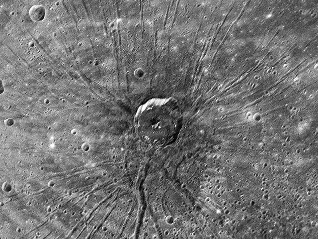 | Detalle de un cráter en Mercurio, fotografiado por la nave Messenger. |