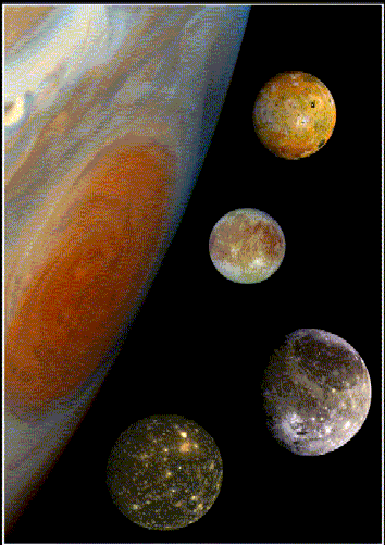 | Los principales satélites de Júpiter. De arriba a abajo: Io, Europa, Ganimedes y Calixto. Sobre Júpiter se ve la Mancha Roja |