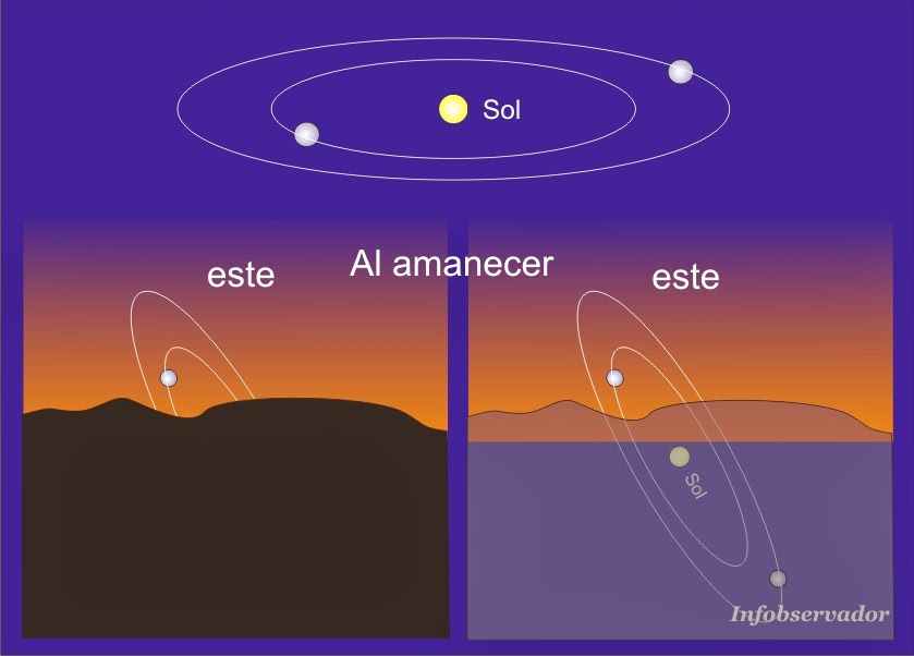Por el contrario, cuando el planeta está al oeste del Sol, antes de que amanezca, es visible sobre el horizonte.