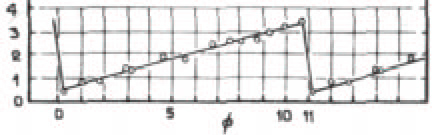 Variación anual del aumento de la umbra. La curva de arriba representa las observaciones de contactos de cráteres en los eclipses. Los picos de abajo son los máximos de las lluvias meteóricas.