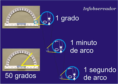 Comparación de los ángulos con un transportador. Abajo a la izquierda se representa un ángulo de 50 grados. Arriba, ampliado, un ángulo de 1 grado. Luego, si lo divides por en 60 veces, el resultado es de un minuto de arco. Nuevamente si divides 1 minuto de arco en 60 veces, obtienes un ángulo insignificante, 1 segundo de arco.