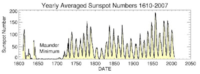 El gráfico arriba requiere algunas aclaraciones. En el eje vertical, la actividad solar. Cada pico es el máximo de actividad, y la distancia en tiempo de dos mínimos es aproximadamente 11 años. Representa el periodo desde 1600 (cuando Galileo comenzó las observaciones) hasta la actualidad.