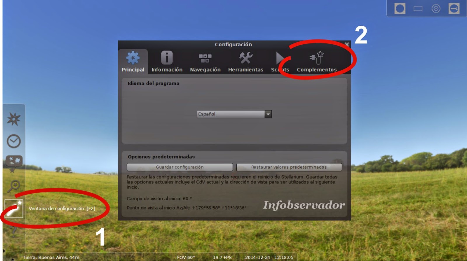 Se abre una ventana nueva mas pequeña. Debes entrar en la solapa (2) - "Complementos". (Puede decir también "Plugins".)
