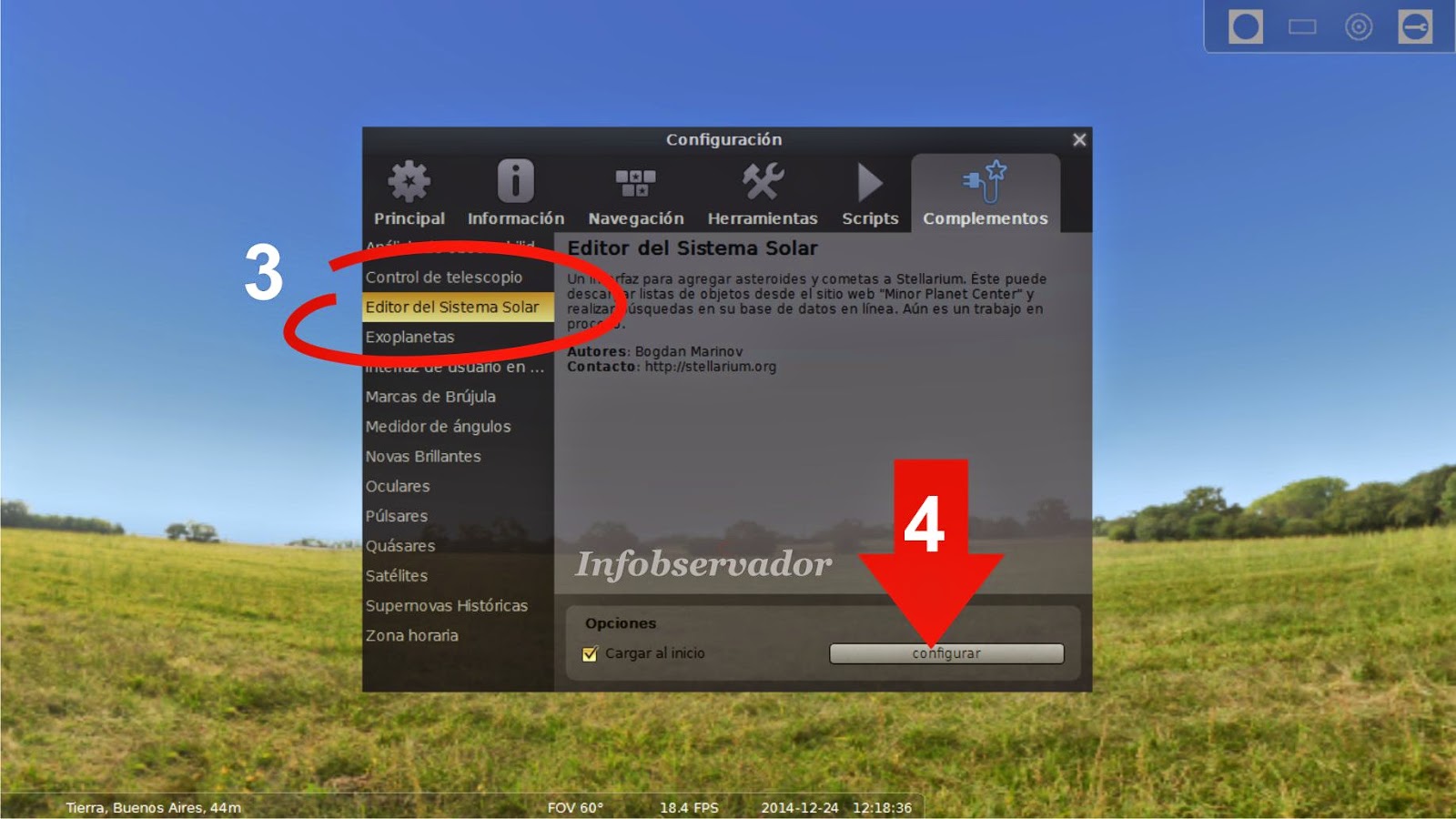 Luego vas a la izquierda en (3) - "Editor del Sistema Solar", y luego presionas (4) "Configurar". Asegurate que este marcado a la izquierda, "Cargar al inicio". Sino, la próxima vez que entres al programa, no estará el nuevo objeto.