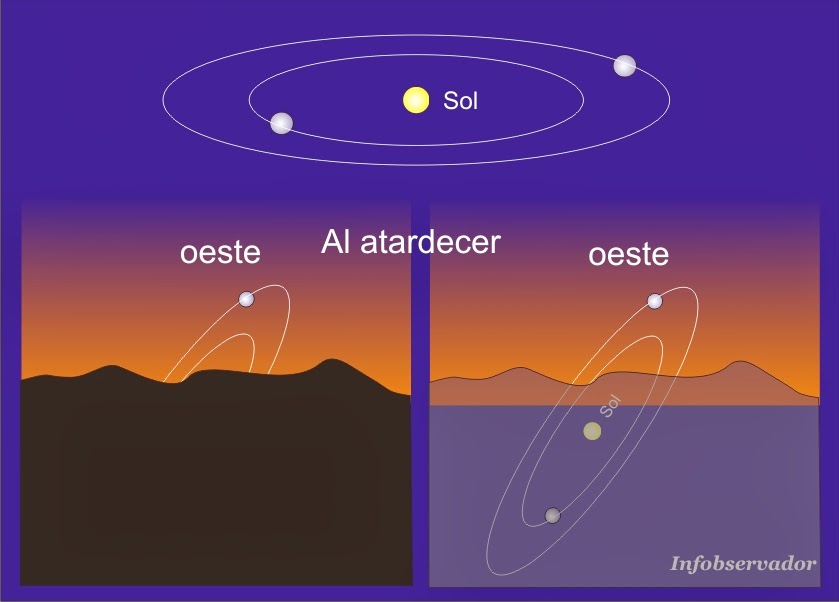 En el momento en que los planetas internos están de un lado de su órbita alrededor del Sol, (más al este del Sol), se ocultan después que nuestra estrella lo hace. Así, el planeta todavía está sobre el horizonte, siendo visible al atardecer.