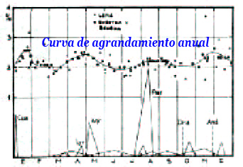 Variación anual del aumento de la umbra. La curva de arriba representa las observaciones de contactos de cráteres en los eclipses. Los picos de abajo son los máximos de las lluvias meteóricas.