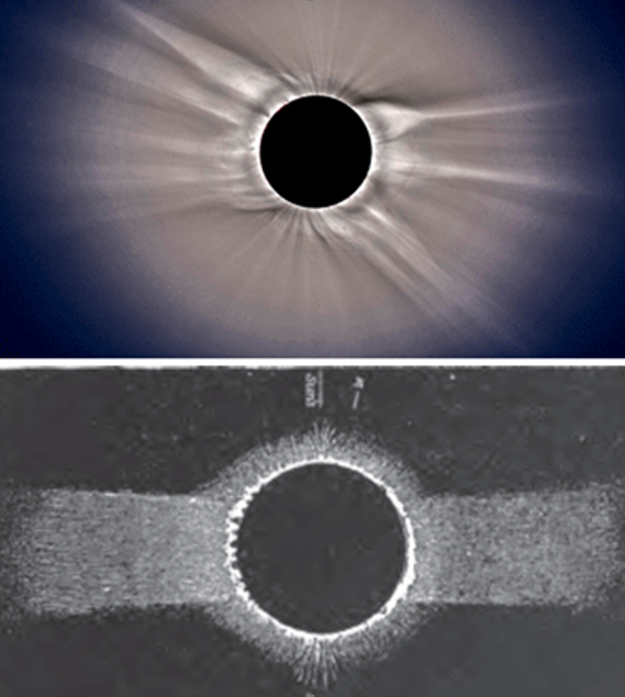 | Compárese el aspecto de la corona solar durante el eclipse de 1867, en el dibujo realizado por L. Grosch con la fotografía de arriba, correspondiente al eclipse de Marzo de 2006. La corona solar, la capa externa de la atmósfera del sol, se ve afectada por el campo magnético, el cual varía con el tiempo. |
