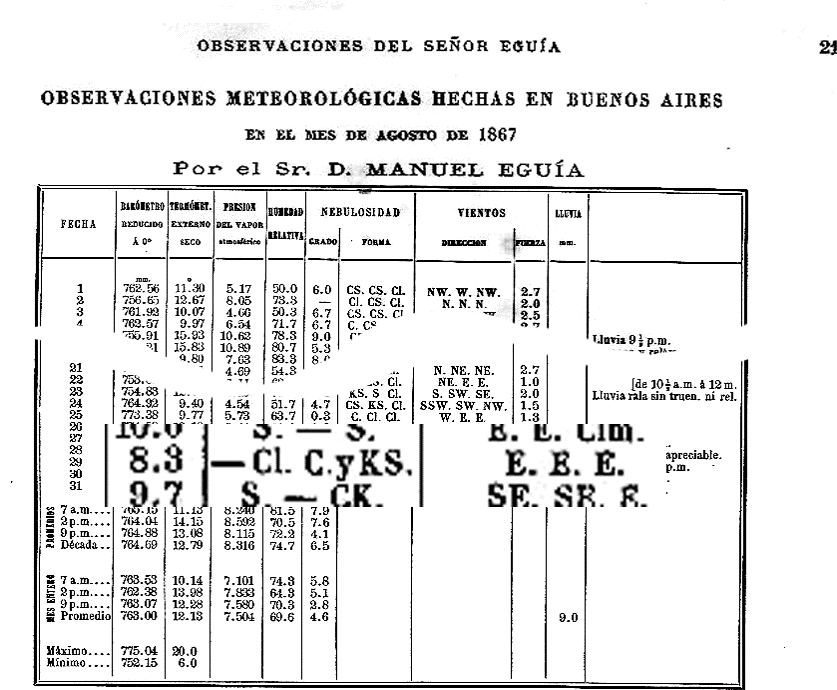 Aquí encontramos una referencia meteorológica para el día anterior. Totalmente cierta ya que según el registro meteorológico había estado totalmente nublado y lloviendo. En el mismo registro, consta que el día del eclipse estuvo también nublado en casi el 90% por cúmulos y cirros y con nieblas a diferentes horarios. Esto frustró por completo la observación del fenómeno que tuvo lugar a las siete de la mañana, que, si la nubosidad era importante, el eclipse se habría percibido como un oscurecimiento, aun mayor al reinante, de 2 minutos. Este reporte meteorológico fue confeccionado por Manuel Eguía, quien llevó un registro muy completo durante unos años hasta que en 1872 se inauguró – también a instancias de Domingo Faustino Sarmiento- el Servicio Meteorológico Nacional. Llamado en sus inicios Oficina Meteorológica Argentina, fue la tercera fundada en el mundo, después de Hungría y Estados Unidos.